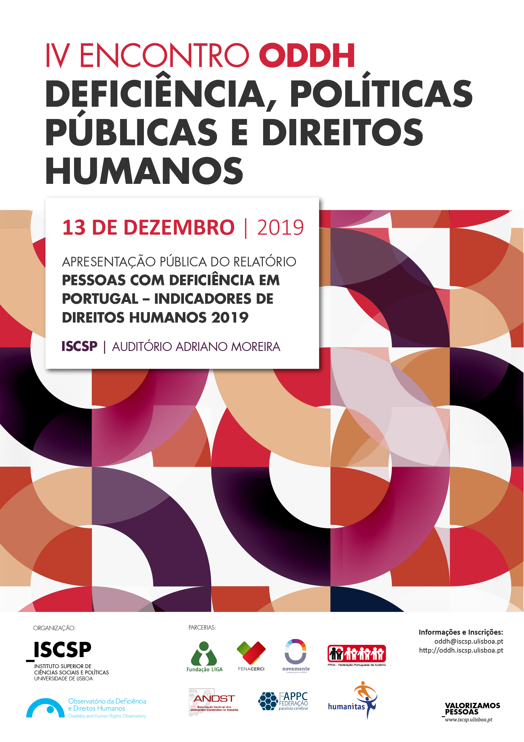O Observatório da Deficiência e Direitos Humanos (ODDH) realiza o seu IV Encontro - Deficiência, Políticas Públicas e Direitos Humanos, no próximo dia 13 de dezembro de 2019, no Instituto Superior de Ciências Sociais e Políticas (ISCSP), da Universidade de Lisboa. Nesta edição, que se realiza na data em que se assinala o 13º aniversário da adoção, pela ONU, da Convenção sobre os Direitos das Pessoas com Deficiência (CDPD), pretende-se promover uma reflexão alargada sobre a implementação deste instrumento em Portugal.